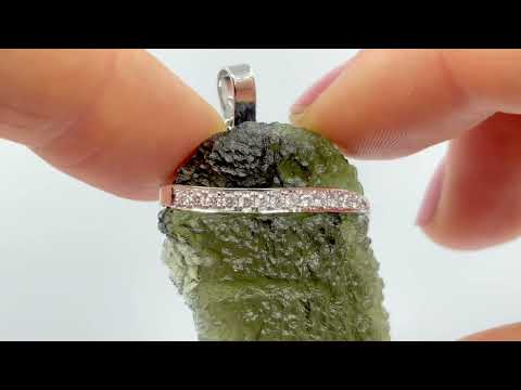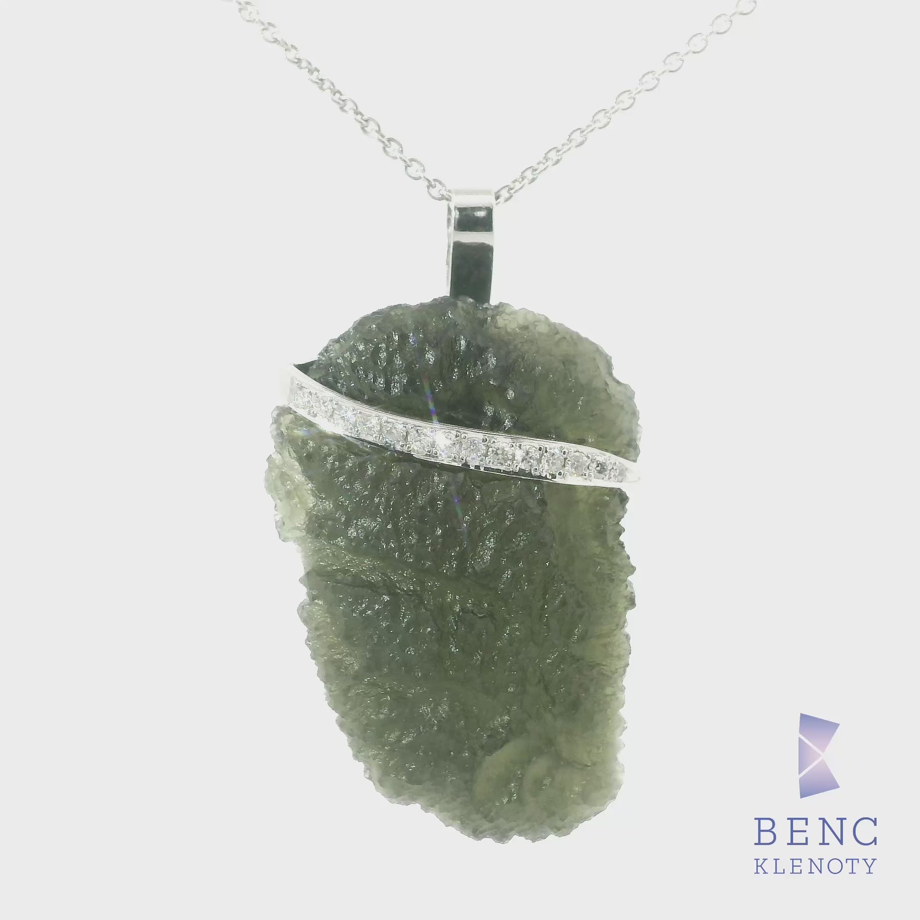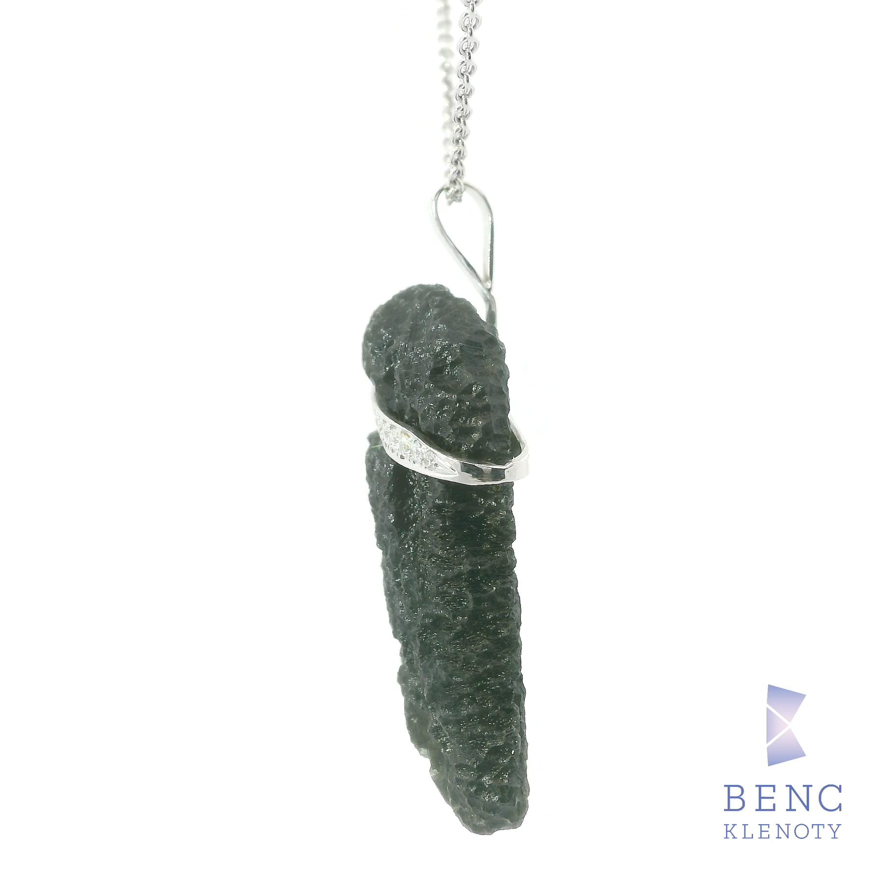 Vltavín je decentně, ale luxusně, orámován linií třpytivých dimantů , které dodávají celému šperku nádech extravagance a podtrhují jeho hodnotu. Diamanty jsou přesně zasazeny v pásu bílého zlata , který elegantně kopíruje obrys kamene.
