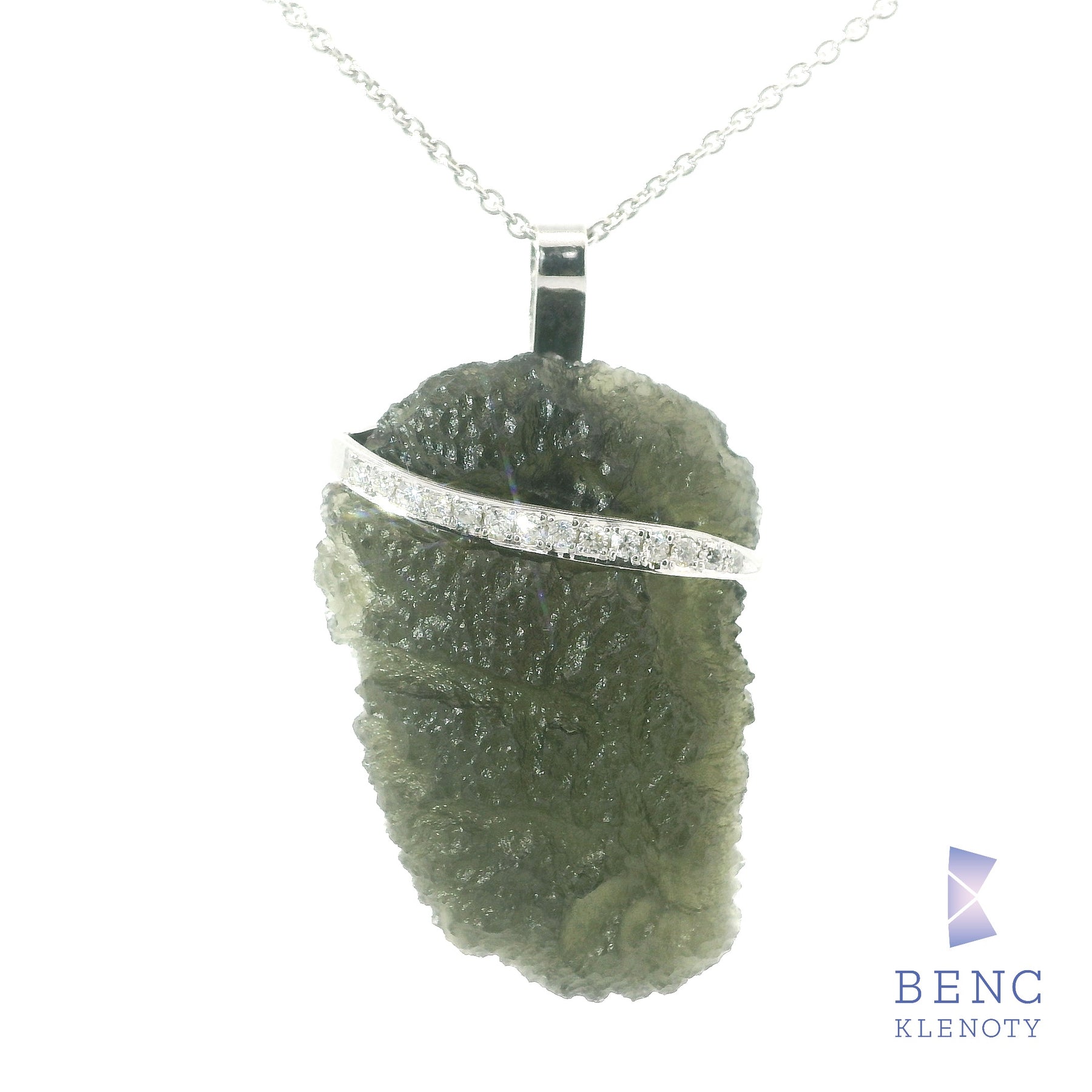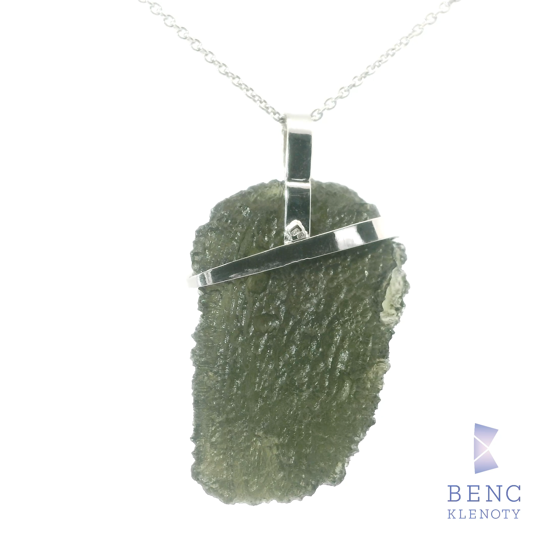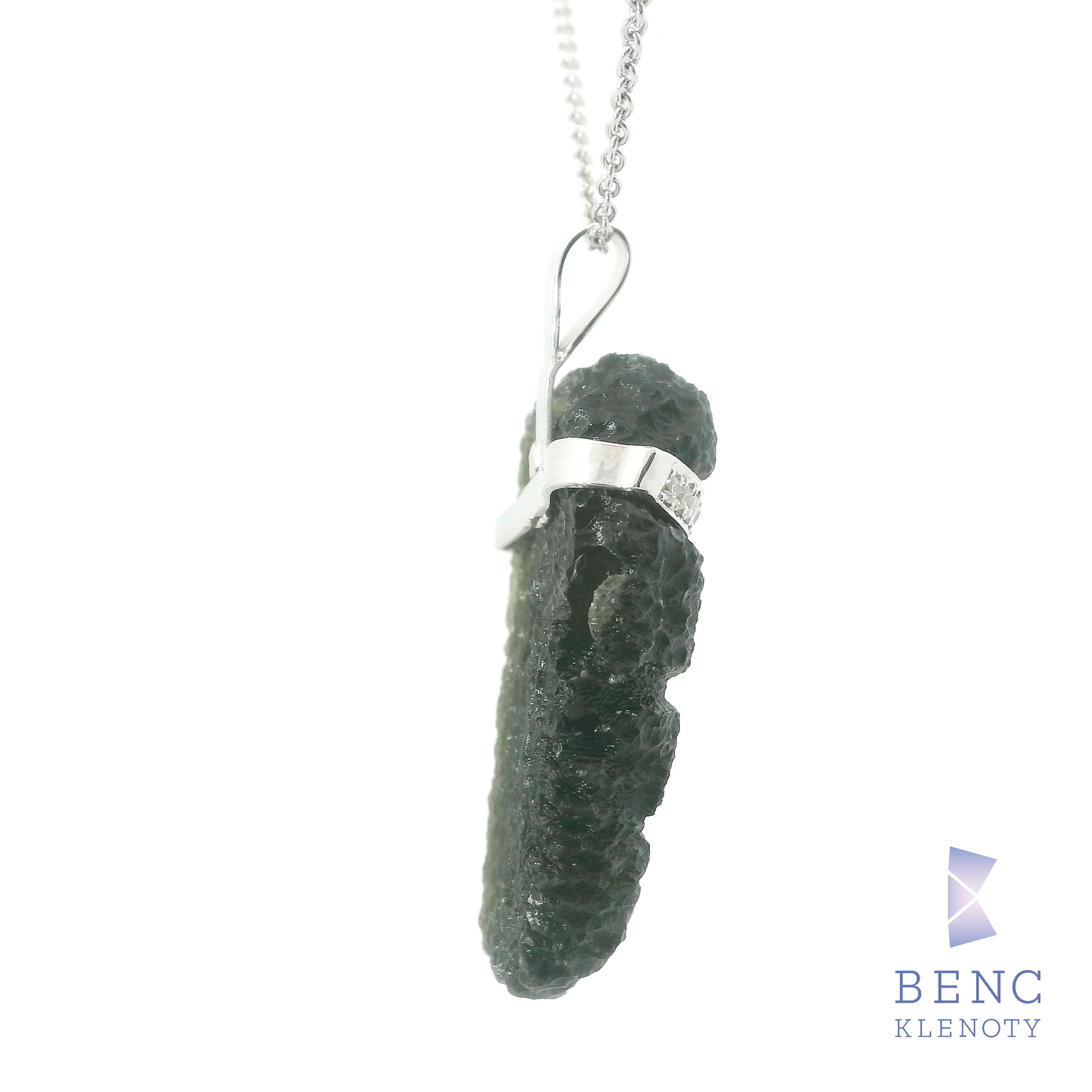 Dominantou přívěsku je surový vltavín (český drahokam, tektit), který si zachovává svůj jedinečný, přírodní tvar a nádhernou zelenou barvu. Vltavín je magmatického původu, vzniklý dopadem meteoritu, a každý kus je tak absolutní originál .