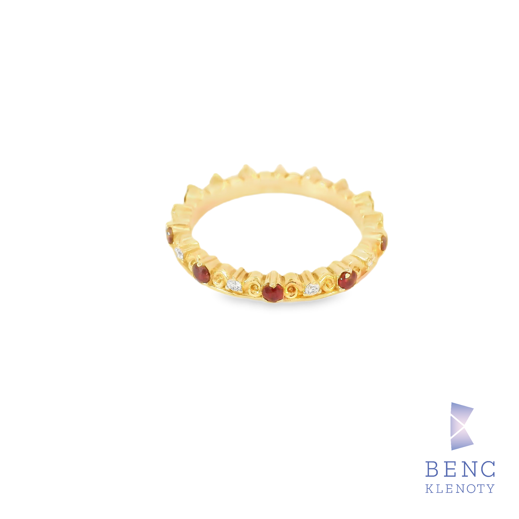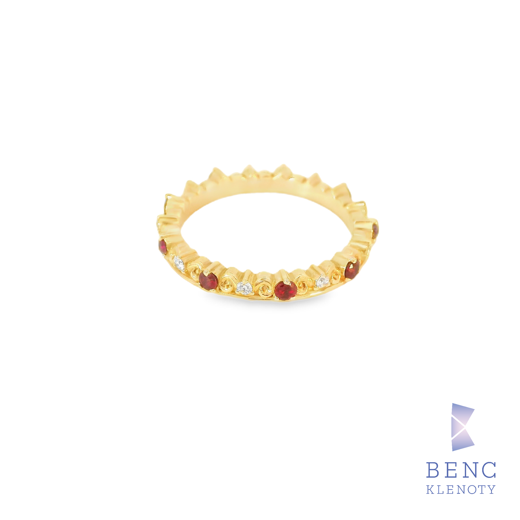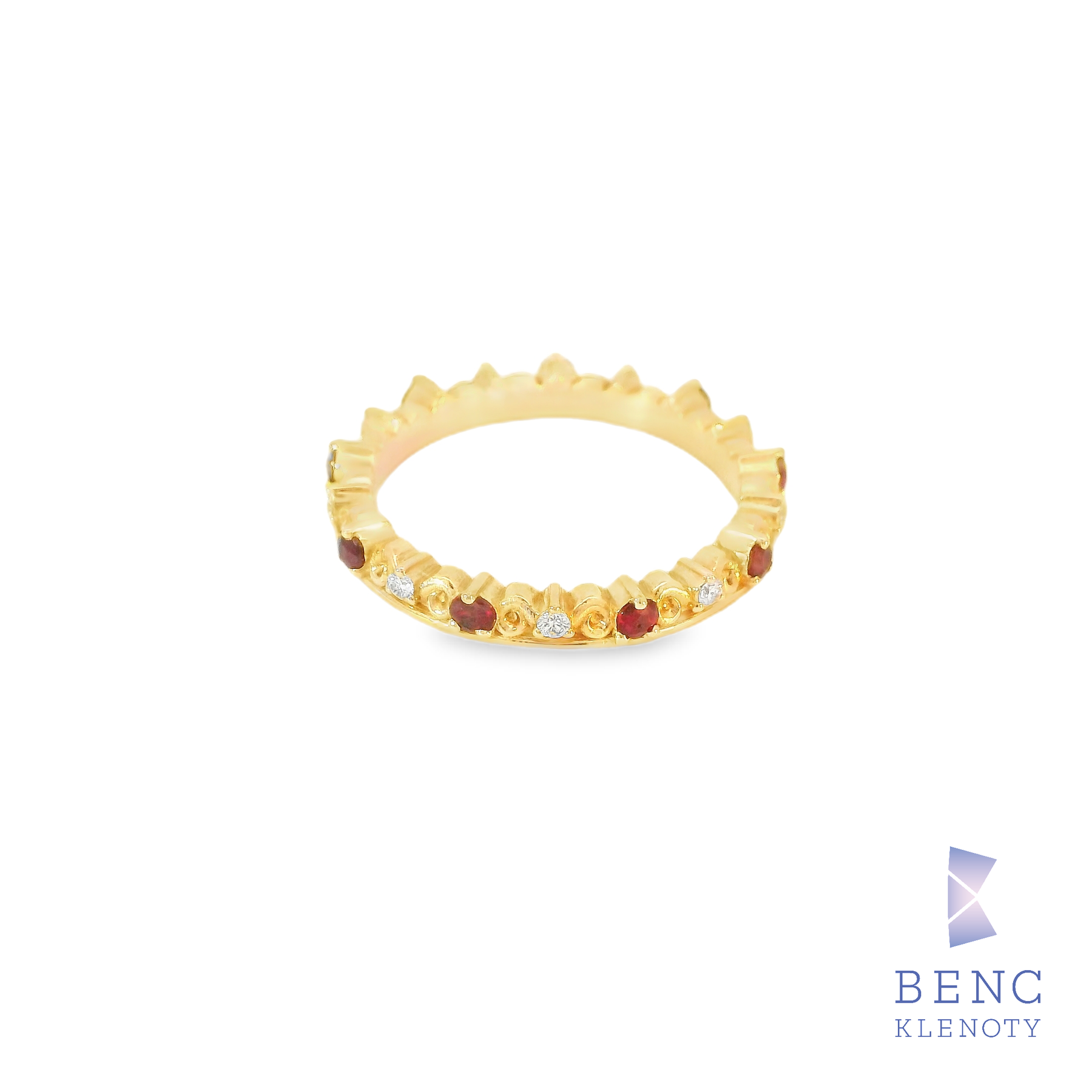Tento úchvatný zlatý prsten se vyznačuje jedinečným designem, který zdobí třpytivé rubíny a diamanty.