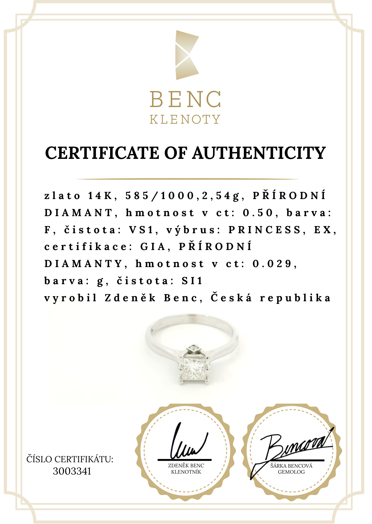 PŘÍRODNÍ DIAMANT, hmotnost v ct: 0,50, barva: F, čistota: VS1, výbrus: PRINCESS, EX, certifikace: GIA