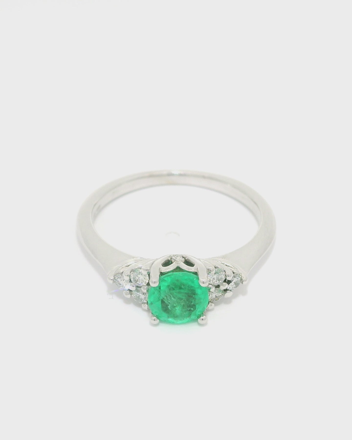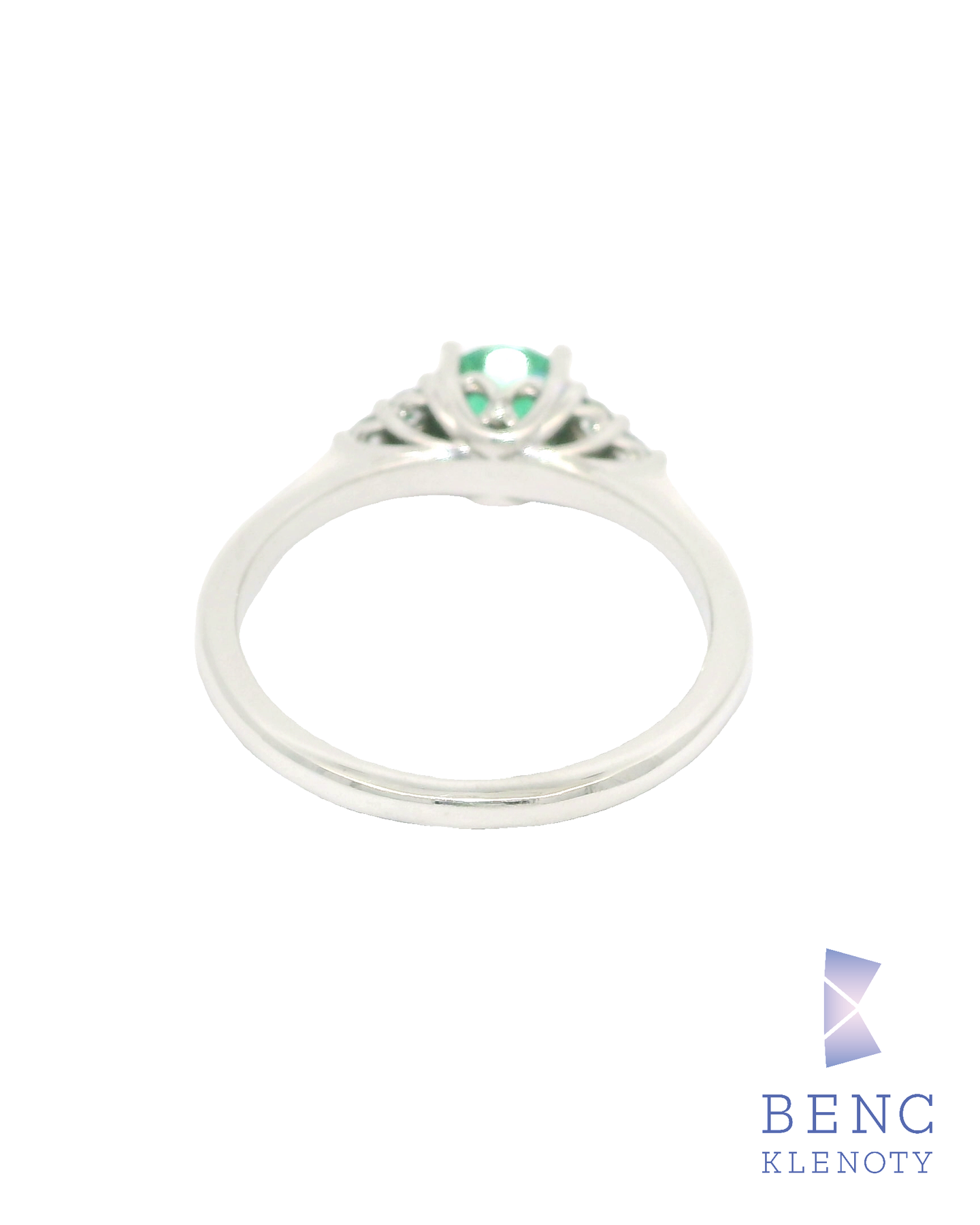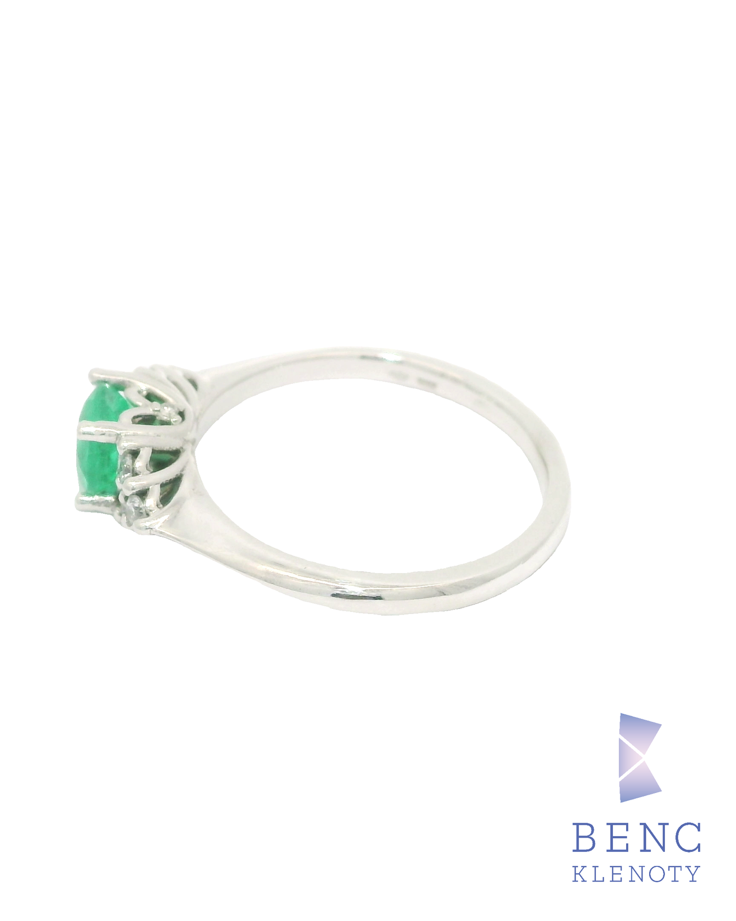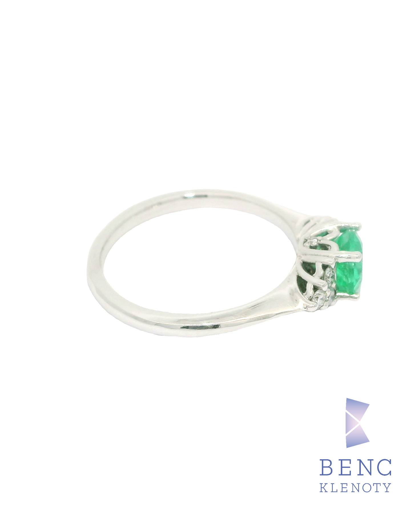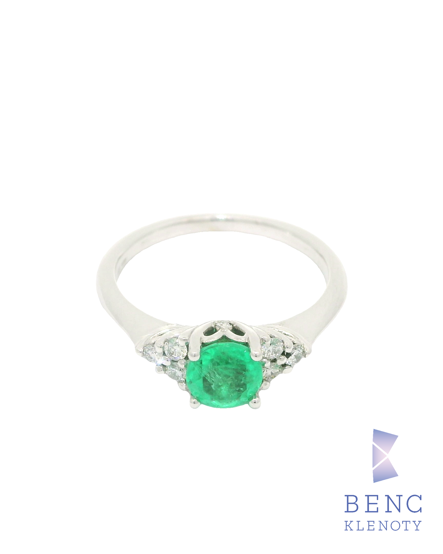 Sytě zelený smaragd uprostřed prstenu vyniká svou přirozenou krásou, zatímco jemné diamanty v jeho okolí přidávají zářivý třpyt.