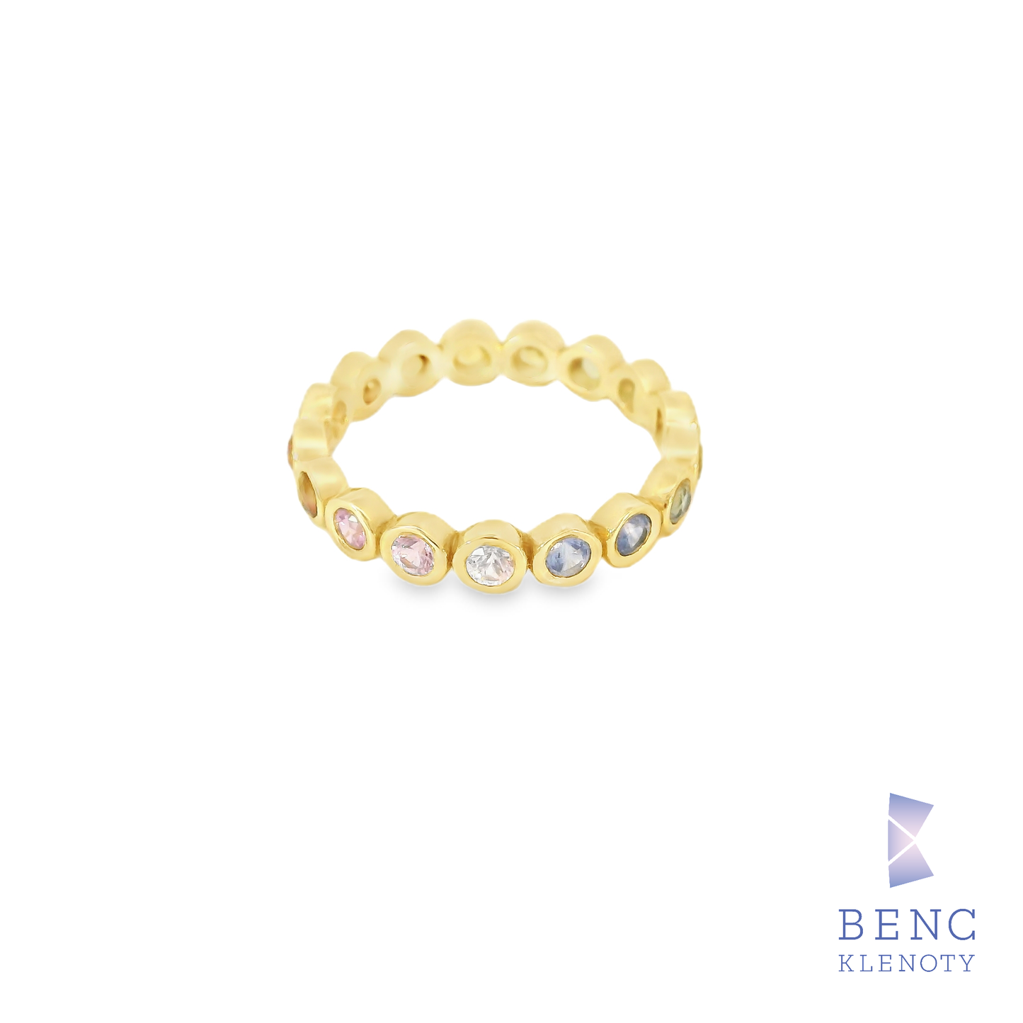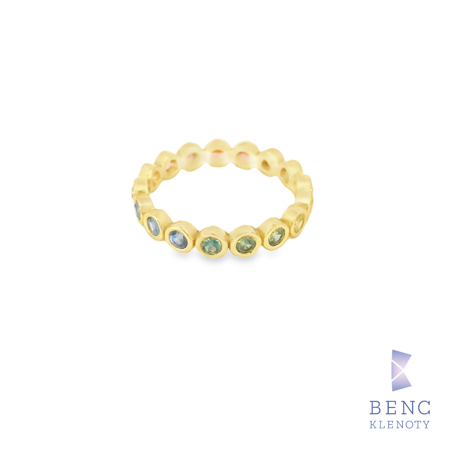 Tento nádherný prsten zdobí oslnivá řada barevných safírů zasazených do elegantního zlatého pásku.
