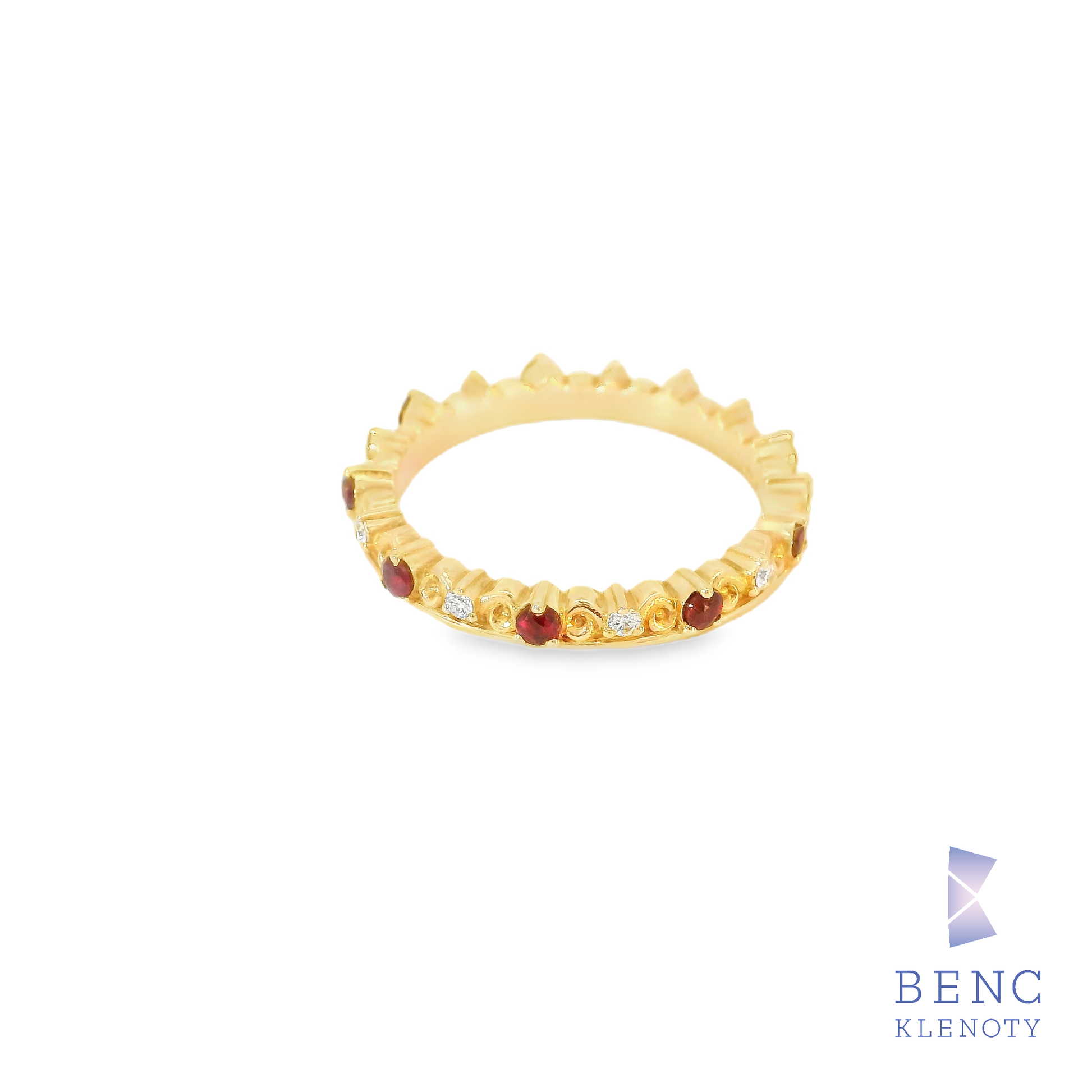 Tento úchvatný zlatý prsten se pyšní jedinečným designem, který zdobí třpytivé rubíny a diamanty.