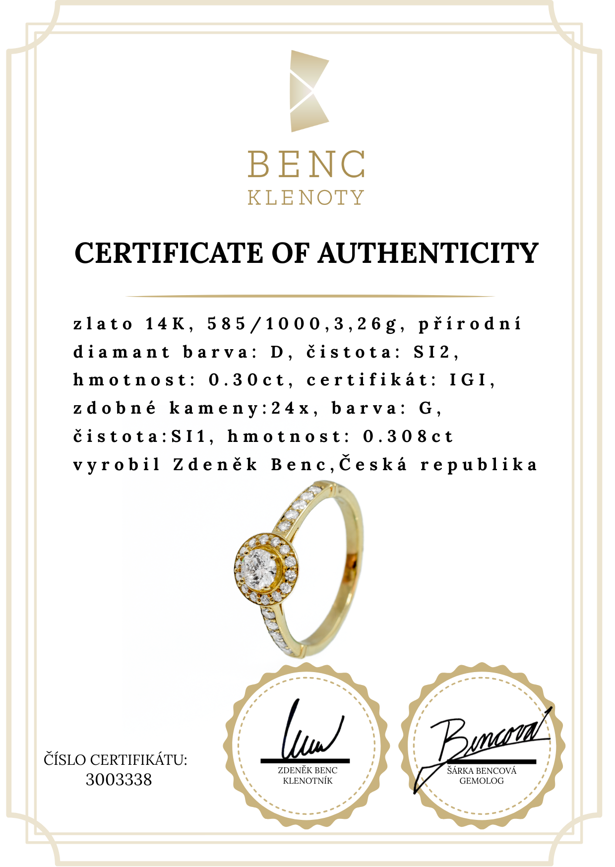 PŘÍRODNÍ DIAMANT, barva: D, čistota: SI2, hmotnost: 0.30ct, certifikát: IGI |